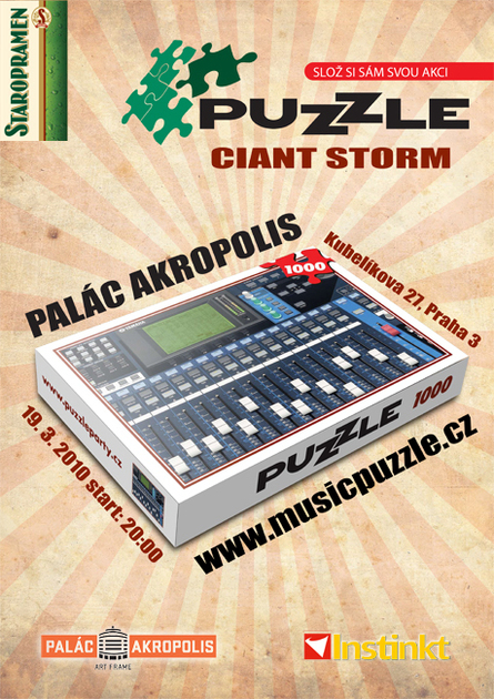 Projekt Music Puzzle vznikl ze spolupráce Paláce Akropolis, pivovaru Staropramen a časopisu Instinkt na podporu novým hudebním projektům. Ukázkou propojení hudby s obrazem a užití nových technologií si budete moci vychutnat už v pátek 19. 3. ve velkém sále Paláce Akropolis. PA v koprodukci s uměleckým sdružením CIANT připravil program Ciant Storm. Jde o audio vizuální show spojenou s motion capture technologií a sami si taky budete moci částečně vyzkoušet nové technologie. Po půlnoci se celý program přesouvá na bary, kde vás budou do rána bavit live acty a DJs + videoprojekce od NXgraphics a Sheby.