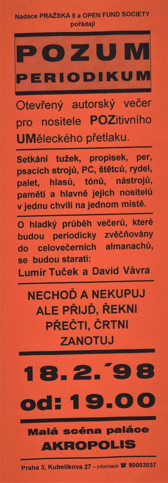 STRANA 6/8, únor 1998, tištěný měsíční program PASTRANA 7/8, únor 1998, tištěný měsíční program PASTRANA 1/8 TITULNÍ, únor 1998, tištěný měsíční program PAPOZUM PERIODIKUM, tištěný program PAPOZUM PERIODIKUM, červen 1998POZUM PERIODIKUM, červen 1998POZUM PERIODIKUM: Lumír TUČEK + David VÁVRAPOZUM PERIODIKUM: Lumír TUČEKPOZUM PERIODIKUM: Lumír TUČEK + David VÁVRAPOZUM PERIODIKUM: František SKÁLA