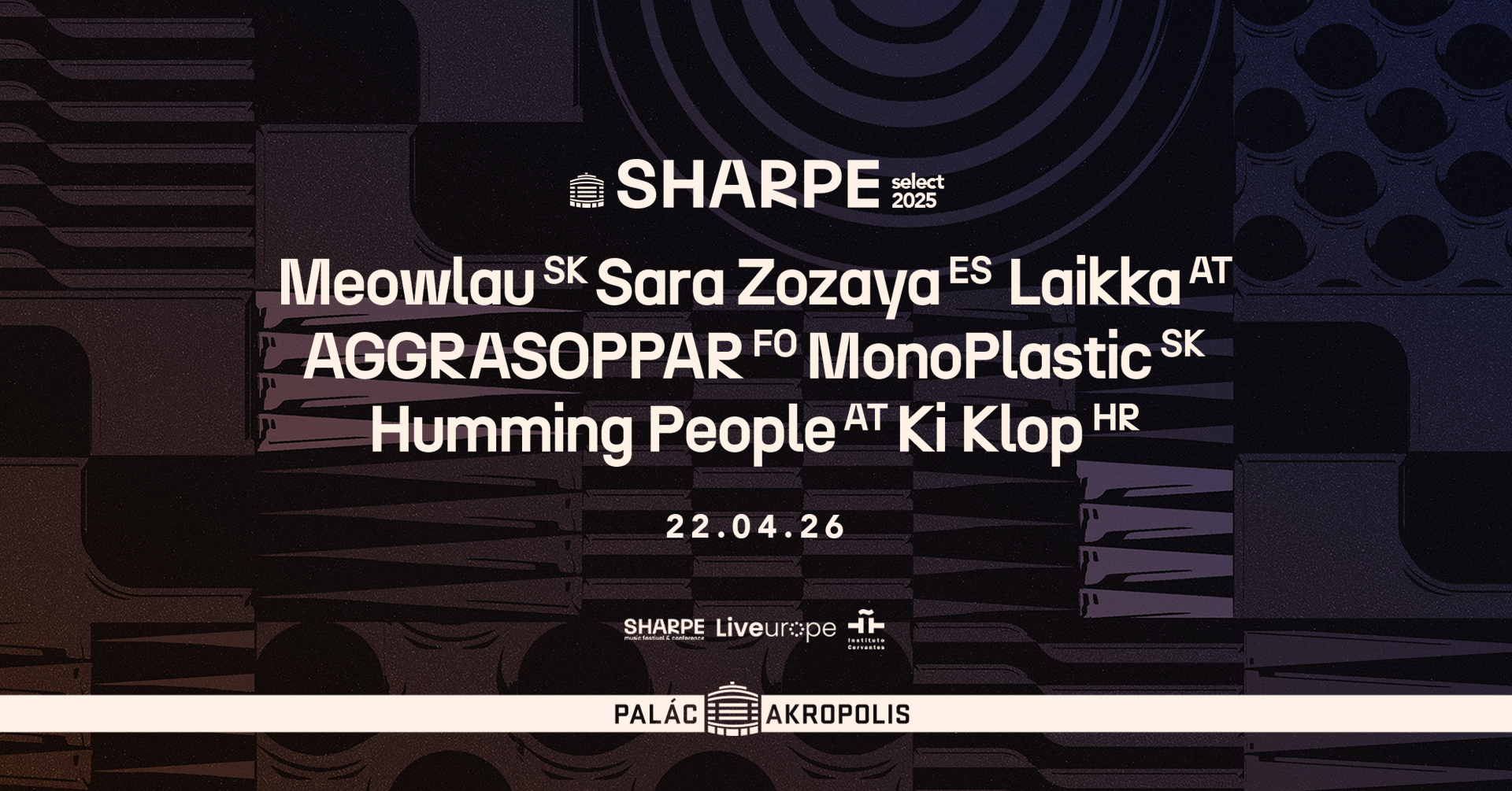 info SHARPE select se po roce vrací do Paláce Akropolis! Po úspěšném loňském pilotním ročníku, který vznikl ze spolupráce Paláce Akropolis a respektovaného slovenského showcase festivalu a konference SHARPE, představíme i letos v Praze několik zajímavých umělců. Akropole znovu otevře všechna tři pódia a nechá je rozezvučet tím nejaktuálnějším z evropské nezávislé scény napříč žánry — od taneční energie přes experimentální polohy až po jemnější podmanivou alternativu. SHARPE select nabízí koncentrovaný hudební zážitek během jednoho večera, který ctí ducha bratislavského festivalu SHARPE a přináší do Prahy to nejzajímavější, co aktuálně rezonuje evropskou scénou — nové objevy, vycházející hvězdy a kapely, o kterých ještě uslyšíte. Meowlau (SK) Slovenská hudebnice Laura Jašková, známá z kapely Billy Barman nebo projektu Meowlau x Val, představuje svou sólovou tvorbu pod jménem Meowlau. Debutové album Kvety (2026), které vzniklo ve spolupráci s producentem Matejem Turcerem, přináší osobní písně balancující mezi indie, alternativním popem a post-punkovou energií. Naživo vystupuje s kapelou a patří k nejzajímavějším novým hlasům současné slovenské scény. Sara Zozaya (ES) Baskická zpěvačka a skladatelka ze San Sebastiánu patří k výrazným jménům současné španělské nezávislé scény. Její hudba kombinuje ambientní atmosféru, jemnou elektroniku a intimní písničkářství, které stojí na křehkém vokálu a citlivé práci se zvukem. Koncerty vytvářejí soustředěnou, téměř filmovou atmosféru. Laikka (AT) Rakouský projekt Laikka přináší teatrální a žánrově otevřený post-pop, který propojuje glitchovou elektroniku, silné emoce a výrazné melodie. Jejich hudba osciluje mezi popovou melancholií a explozivní energií a na pódiu získává téměř performativní rozměr. Po albech Morning Glow (2021) a Bleach (2023) a turné s kapelou ÄTNA na sebe Laikka upozornili nominací na Amadeus Austrian Music Awards i zapojením do evropského programu SHAPE+. AGGRASOPPAR (FO) Trio z Faerských ostrovů patří k novým objevům severoevropské scény. Eyðfinn B. Lamhauge, Dania O. Tausen a Trygvi Danielsen spojují výrazné vokály, elektroniku a experimentální přístup k popovým strukturám. Po EP døgurðaslang a MIDNÁTTARSANG získala kapela nominace na Faroese Music Awards a vystoupila na řadě evropských showcase festivalů. MonoPlastic (SK) Slovenské duo MonoPlastic vytváří temnější elektronický art-rock, v němž se potkávají syntezátory, post-punkové kytary a rytmy drum machine. Typická je pro ně hypnotická rytmika, výrazná basová linka a postupně gradující struktura skladeb. Koncerty staví na intenzivní atmosféře a dynamickém vrstvení zvuku. Humming People (AT) Rakouské duo Humming People pracuje s minimalistickou elektronikou založenou na syntezátorech, jednoduchých rytmech a hlasu. Z drobných motivů postupně vznikají hypnotické kompozice, které mohou působit meditativně i tanečně zároveň. Ki Klop Záhřebské trio Ki Klop, to je příval energie, která nenechá nikoho v klidu. Jejich hudba spojuje disco groove, hypnotické kytarové linky a pulsující rytmus do nakažlivě tanečního celku. Projekt původně vznikl jako duo, ale s příchodem bubenice a zpěvačky Laury Tandarić se proměnil v plnokrevnou koncertní kapelu, která na pódiu funguje jako dokonale sehraný organismus. Dynamický, lehce teatrální live set Ki Klop publikum snadno vtáhne do jejich zvukového vesmíru. Akce je pořádána za podpory iniciativy Liveurope – první celoevropské platformy podporující koncertní kluby v jejich úsilí uvádět začínající evropské umělce. Projekt Liveurope je spolufinancován programem Evropské unie Kreativní Evropa. |